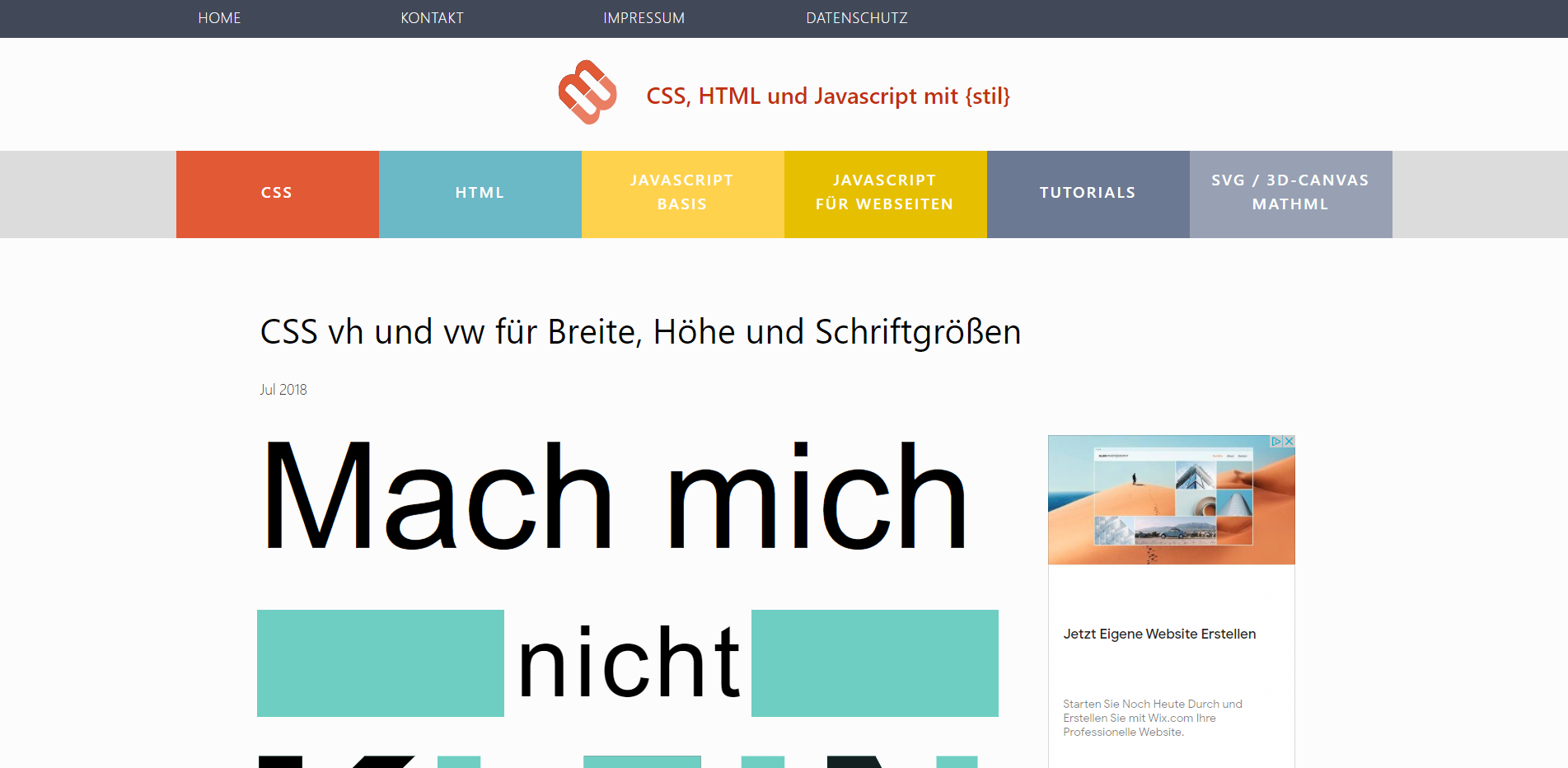 CSS vh und vw für Breite, Höhe und Schriftgrößenha avJanuar 25, 2021CSS, Deutsch, Schriftarten im Web Link CSS Größen schöpfen aus einem großen Fundus: Pixel oder Point, EM oder EX oder REM, Prozent, larger oder smaller. vw und vh ähneln den Prozentangaben, aber sie beziehen sich auf den Viewport und nicht auf das umfassende Element.
