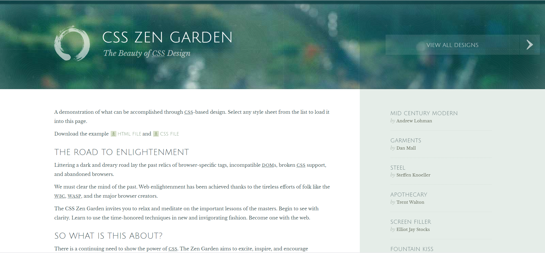 A demonstration of what can be accomplished through CSS-based design. Select any style sheet from the list to load it into this page.